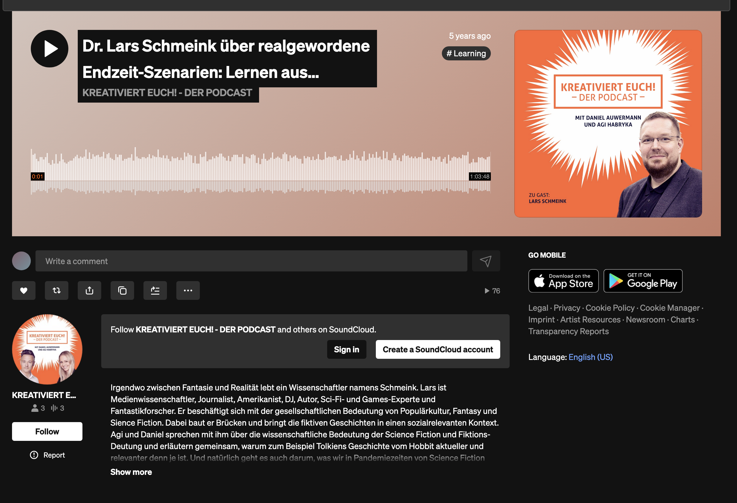 Ich war zu Gast im Podcast „Kreativiert euch“ der Werbeagentur Zum Goldenen Hirschen und habe dort über Science Fiction und das, was sie über unsere Gegenwart und Realität aussagt gesprochen.