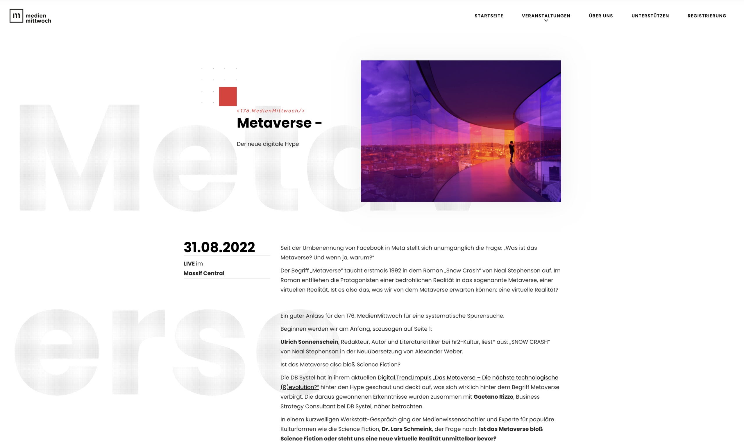 Der MedienMittwoch in Frankfurt (Main) informiert regelmäßig zu wichtigen medialen Themen der Zeit und bringt Experten und interessierte Medienöffentlichkeit zusammen. Auf der 176. Veranstaltung ging es um die Zukunft des Internet und das Thema „Metaverse“. Ich war eingeladen einen Impulsvortrag zu halten und in einem Gespräch Rede und Antwort zu stehen.